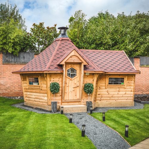 Impressive sloping-walled wooden BBQ huts with the WOW factor! Complete with central BBQ grill and optional drinks bar extensions for all-year-round entertaining.